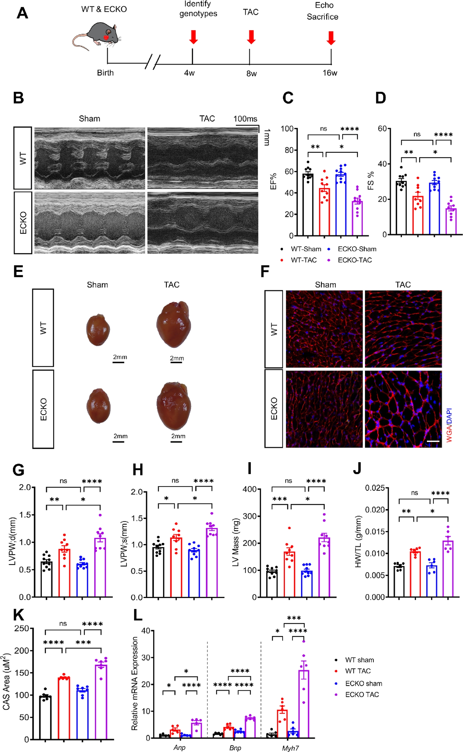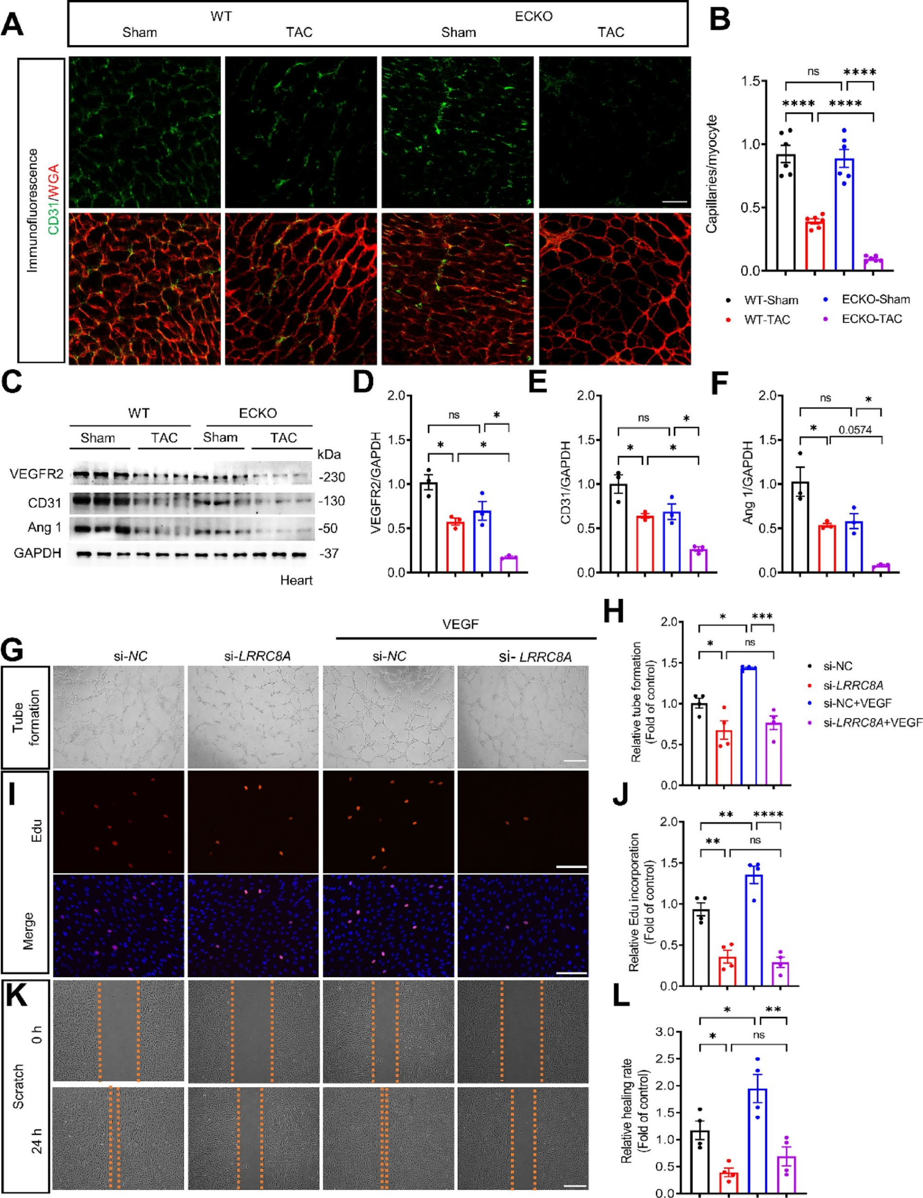 作者发现梗阻性肥厚型心肌病患者和接受TAC手术小鼠的心脏和心脏内皮细胞中LRRC8A下调,表明心脏内皮LRRC8A可能参与TAC驱动的病理性肥大发病机制。为了研究内皮LRRC8A缺陷对压力负荷诱导病理性肥大的直接影响,作者构建了内皮特异性LRRC8A缺失小鼠(ECKO),然后ECKO小鼠和WT小鼠接受TAC或假手术。超声心动图分析显示ECKO和WT假手术组之间的心脏结构和功能没有统计学显著差异,但与WT-TAC小鼠相比,ECKO-TAC小鼠的心功能较差,此外TAC-ECKO小鼠出现更严重的肥大。这些结果表明内皮LRRC8A缺陷会加剧病理性肥大和功能障碍。ScRNA-seq分析显示内皮LRRC8A在压力负荷引起的病理性肥大中充当血管生成基因。