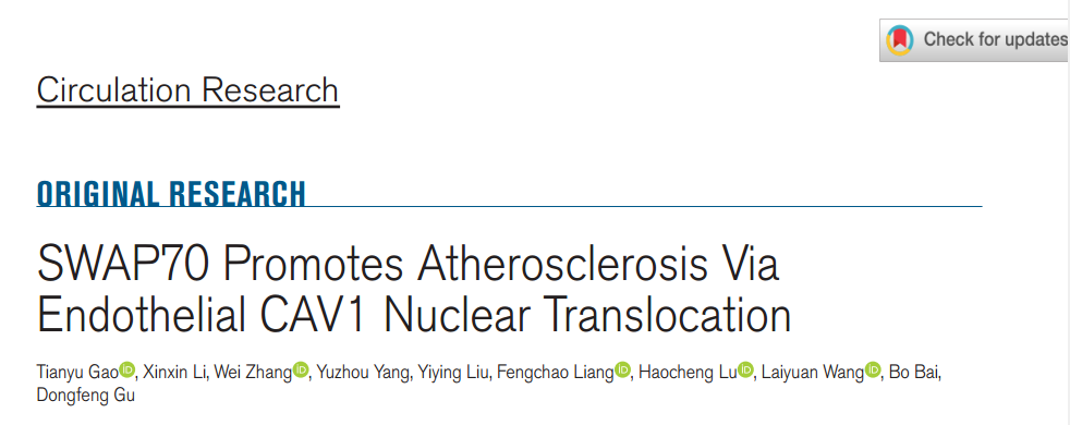 动脉粥样硬化是冠状动脉疾病的主要诱因,血流紊乱与慢性内皮炎症会诱发并加重该病。开关相关蛋白70(SWAP70)是一种多功能信号接头蛋白,其基因上的风险等位基因 rs10840293经遗传学研究证实与冠状动脉疾病的易感性相关,但该蛋白在动脉粥样硬化发生发展中的确切作用尚未明确。2026年1月14日,南方科技大学公共卫生及应急管理学院顾东风教授、白波副研究员团队在Circulation Research(IF16.2)杂志上发表题为 “SWAP70 Promotes Atherosclerosis Via Endothelial CAV1 Nuclear Translocation” 的研究论文,揭示了SWAP70是内皮炎症与动脉粥样硬化的力学响应调节因子,其作用机制为通过CAV1核转位这一新的分子途径发挥调控作用。靶向SWAP70-CAV1信号轴是缓解血管炎症、延缓动脉粥样硬化性心血管疾病进展的潜在有效治疗策略。