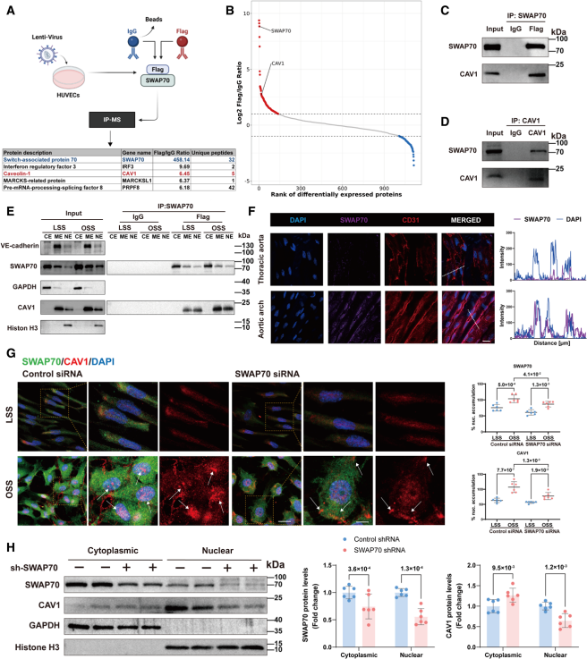 进一步的探索表明,SWAP70调节EC迁移、氧化应激、增殖和eNOS活性,并增强EC中的炎症反应。通过IP-MS筛选SWAP70的相互作用蛋白,鉴定出CAV1 为关键结合伴侣;后续Co-IP实验验证了二者的特异性结合。OSS刺激可显著上调CAV1的蛋白水平,表明CAV1是力学应力和炎症敏感因子。亚细胞定位分析显示,LSS下SWAP70主要定位于细胞质,CAV1富集于细胞膜;而OSS刺激后,二者均向细胞核内转移并显著共定位。此外,SWAP70敲低后,CAV1的核定位显著受抑;反之,CAV1敲低不影响SWAP70在细胞膜、细胞质和细胞核的分布,表明SWAP70的核转位独立于CAV1。对RNA-seq数据的基因本体富集分析显示,SWAP70敲低显著影响 “蛋白转运” 相关基因的表达,进一步支持SWAP70在调控细胞内蛋白定位与转运中的作用。随后的实验表明,抑制CAV1表达能有效减弱SWAP70过表达诱导的炎症因子上调,而使用CAV1支架结构域模拟肽阻断二者结合后,促炎效应显著降低。邻近连接分析进一步证实,在TNF-α或振荡剪切力刺激下,SWAP70-CAV1复合物在细胞核内特异性富集。这些结果说明,SWAP70通过介导CAV1核转位,形成功能性转录复合物,从而放大内皮炎症信号,该过程是SWAP70促动脉粥样硬化作用的核心机制。